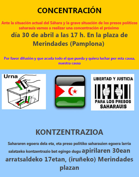 Sahararen egoera dela eta, eta preso politiko saharauien egoera larria salatzeko kontzentrazio bat egingo dugu apirilaren 30ean arratsaldeko 17etan, (iruñeko) Merindades plazan