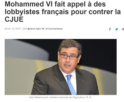 Madrid, sábado 17/02/2018Mohammed VI usa cabilderos franceses para contrarrestar el TJUE sobre la anulación de los acuerdos de pesca que incluye las aguas del Sahara Occidental, territorios ocupados.Algerie Patriotique-Marruecos está presionando para la renovación de su acuerdo de pesca con la Unión Europea (UE), impugnado en sustancia y en forma por el Abogado General del…