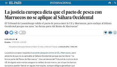 Madrid martes 27 febrero 2018Fuente: El Pais El periódico El País-El Tribunal de Luxemburgo valida el pacto de pesca entre la UE y Marruecos, pero excluye al Sáhara Occidental porque esa zona «no forma parte del Reino de Marruecos»La justicia europea respalda el acuerdo pesquero entre la UE y Marruecos, pero advierte de que no es…