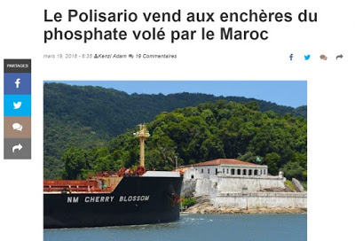 Diario La Realidad Saharaui, DLRS Madrid miércoles 21/03/2018 El F. Polisario subasta en Sudáfrica fosfato robado por Marruecos El periódico Algerie Patriotique, AP-El gobierno Saharaui y el Polisario subastan 55 Mil toneladas de fosfatos expoliados por Marruecos en el buque NM CHERRY BLOSSOM, navío detenido por la Corte de Justicia de Sudáfrica. 473 palabras más