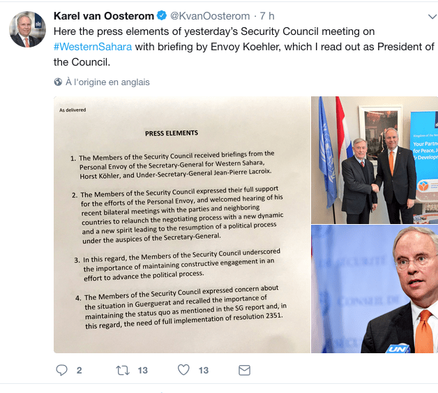 Mhamed Khadad was received by J. Koehler on the eve of his report presentation to UNSC, 21.01.18UN presses on with bid to restart Western Sahara talks, AFP, 22.03.18A la veille la présentation de son rapport au Conseil de sécurité, Koehler reçoit le coordinateur sahraoui avec la MINURSO, SPS, 21.03.18Le Conseil de sécurité pousse pour redémarrer…