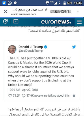 Madrid viernes 27 abril 2018. El presidente de los EEUU Donald Trump advierte a los que apoyan el régimen marroquí en la FIFA y en las Naciones Unidas, ONU. La noticia fue recogida por el canal europeo Euronews en su edición árabe de hoy viernes 27 de abril. Dario la Realidad Saharaui, DLRS-El presidente de los Estados…