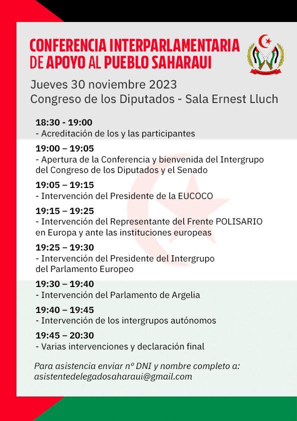 Madrid (ESC).- En el marco de la 47ª Conferencia Europea de Solidaridad con el Pueblo Saharaui (EUCOCO), que tendrá lugar los días 1 y 2 de diciembre en Toledo bajo el lema “La independencia es la única solución”, se celebra una reunión interparlamentaria en el Congreso de los Diputados el jueves día 30 (sala Ernest Lluch de 18H30 a 20H30) que reunirá a grupos e intergrupos de apoyo al Sáhara Occidental.