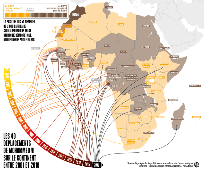 Le royaume chérifien, qui boudait depuis plus de trente ans l’Union africaine en raison de sa reconnaissance de la République arabe sahraouie démocratique, pourrait réintégrer l’organisation le 30 janvier. Mohammed VI a récemment multiplié ses déplacements sur le continent, espérant rallier de nouveaux pays à sa cause.