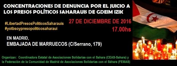 De son côté, la Confédération syndicale des commissions ouvrières espagnoles a appelé à un rassemblement demain en face de l’ambassade du Maroc à Madrid pour exprimer la solidarité avec les prisonniers politiques sahraouis de Gdeim Izik, dans un communiqué publié sur son site internet samedi. Plusieurs villes espagnoles ont aussi décidé d’organiser des manifestations pour exprimer leur soutien et leur solidarité avec les prisonniers de Gdeim Izik, notamment à Madrid, où la Coordination espagnole des associations de solidarité avec le Sahara (CEAS-Sahara) a appelé à un rassemblement devant l’ambassade du Maroc pour exiger la libération des prisonniers politiques sahraouis, le 27 décembre.