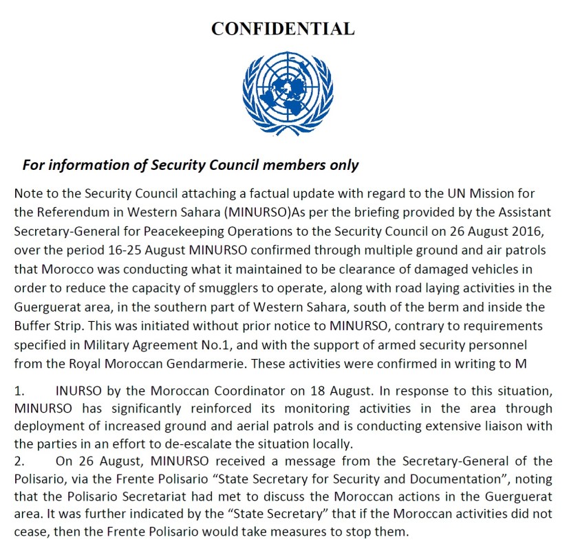 A ello se le suma que el 1 de agosto de 2016 el portavoz del Secretario General de Naciones Unidas había anunciado que el Enviado Personal del SG de la ONU para el Sahara Occidental, Christopher Ross, pensaba reactivar las negociaciones con una «propuesta formal».