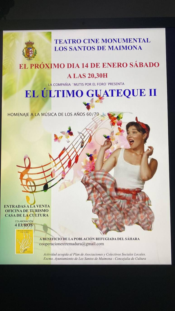 La compañía teatral ‘Mutis por el Foro’ representará este sábado 14 de enero en el Teatro Cine Monumental su obra ‘El Último Guateque II’. Lo hace en beneficio de la población refugiada del Sáhara.