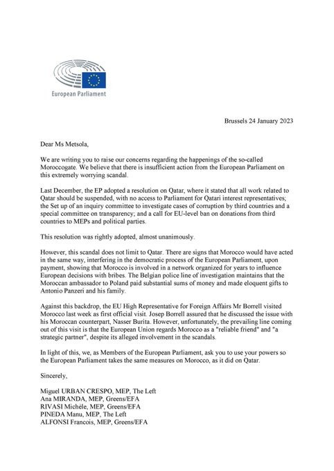 Eurodiputados del grupo de la Izquierda, los Verdes, varios socialistas y un liberal firman esta misiva, que exige que la Eurocámara adopte contra Rabat las mismas medidas que ya aprobó contra Catar, a raíz de la trama de sobornos que involucra a ambos países. En diciembre, la institución aprobó casi por unanimidad una resolución que prohíbe la entrada de representantes cataríes a la Cámara. Además, congeló todas las decisiones que tenían que ver con este país mientras duren las investigaciones.